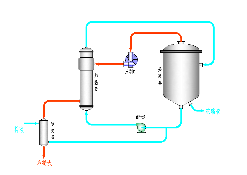由加热室、分离室、循环泵、蒸汽压缩机、气液分离器、除雾器构成。加热室加热,分离室分离气液,循环泵推动溶液强制循环,蒸汽压缩机压缩二次蒸汽实现循环利用,气液分离器与除雾器提升蒸汽纯度。工作原理